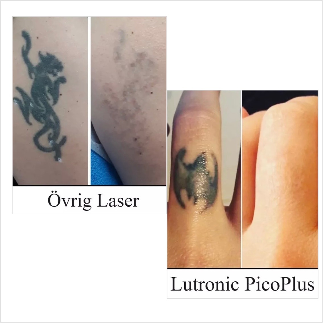 Till skillnad från våra konkurrenters lasrar (Q-switch, PicoLo, Spectra, Fotona) kan PicoPlus tack vare marknadens kortaste pulseringshastighet ta bort hela tatueringen, både färg och svart. Andra typer av laser klarar inte av att bryta ned alla pigment, vilket efterlämnar något som ser ut som ett vattenmärke eller en skugga. Vi är ensamma i Malmö och Jönköping med att erbjuda fullständig borttagning!
